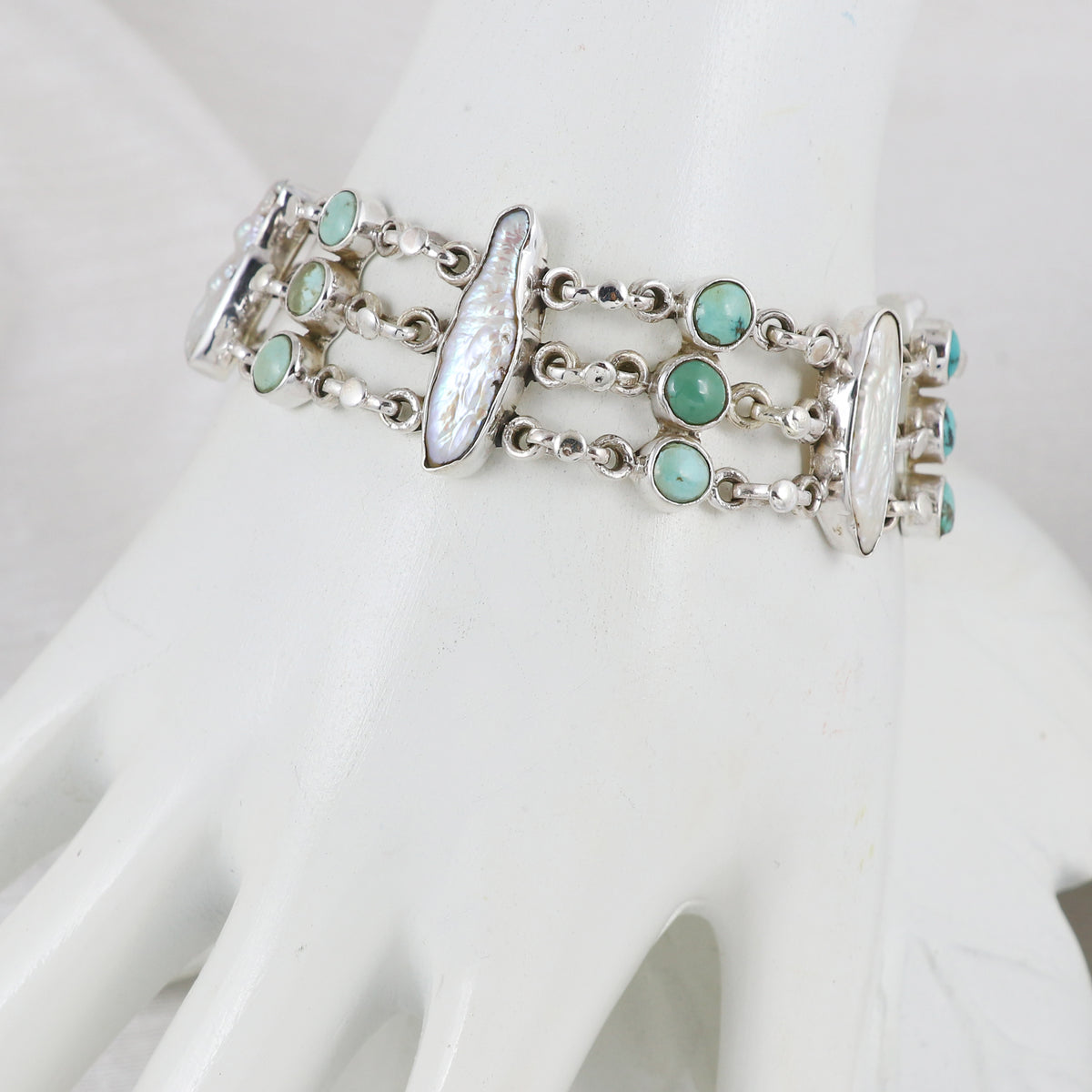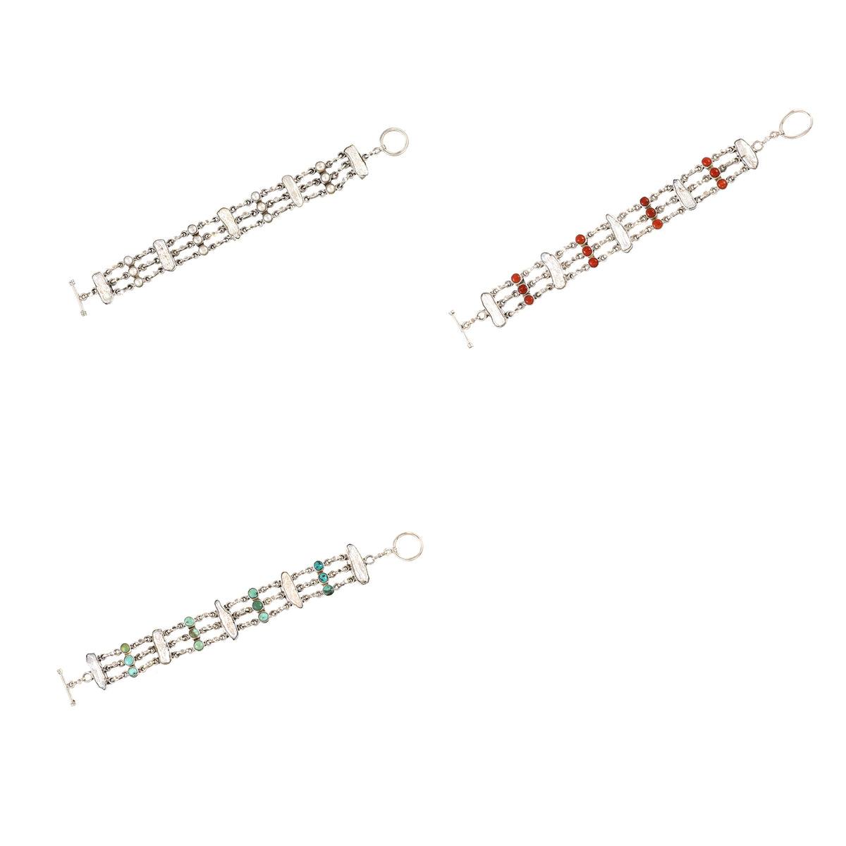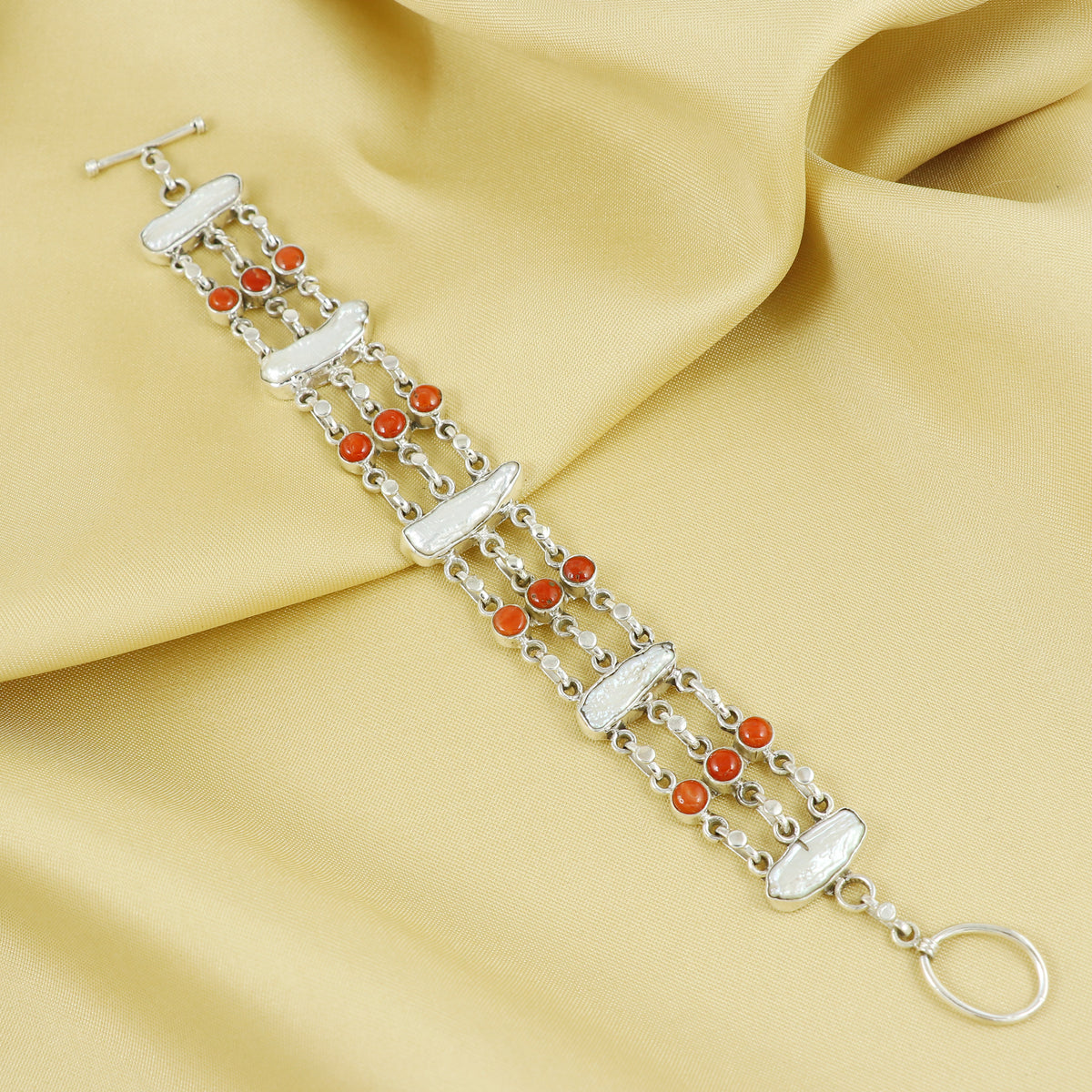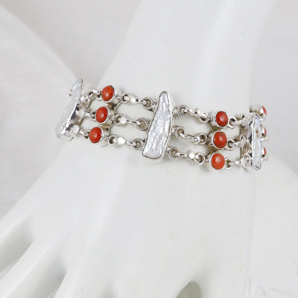 Sterling Silver Precious Designer CORAL, PEARL, TURQUOISE Gemstone Bracelet