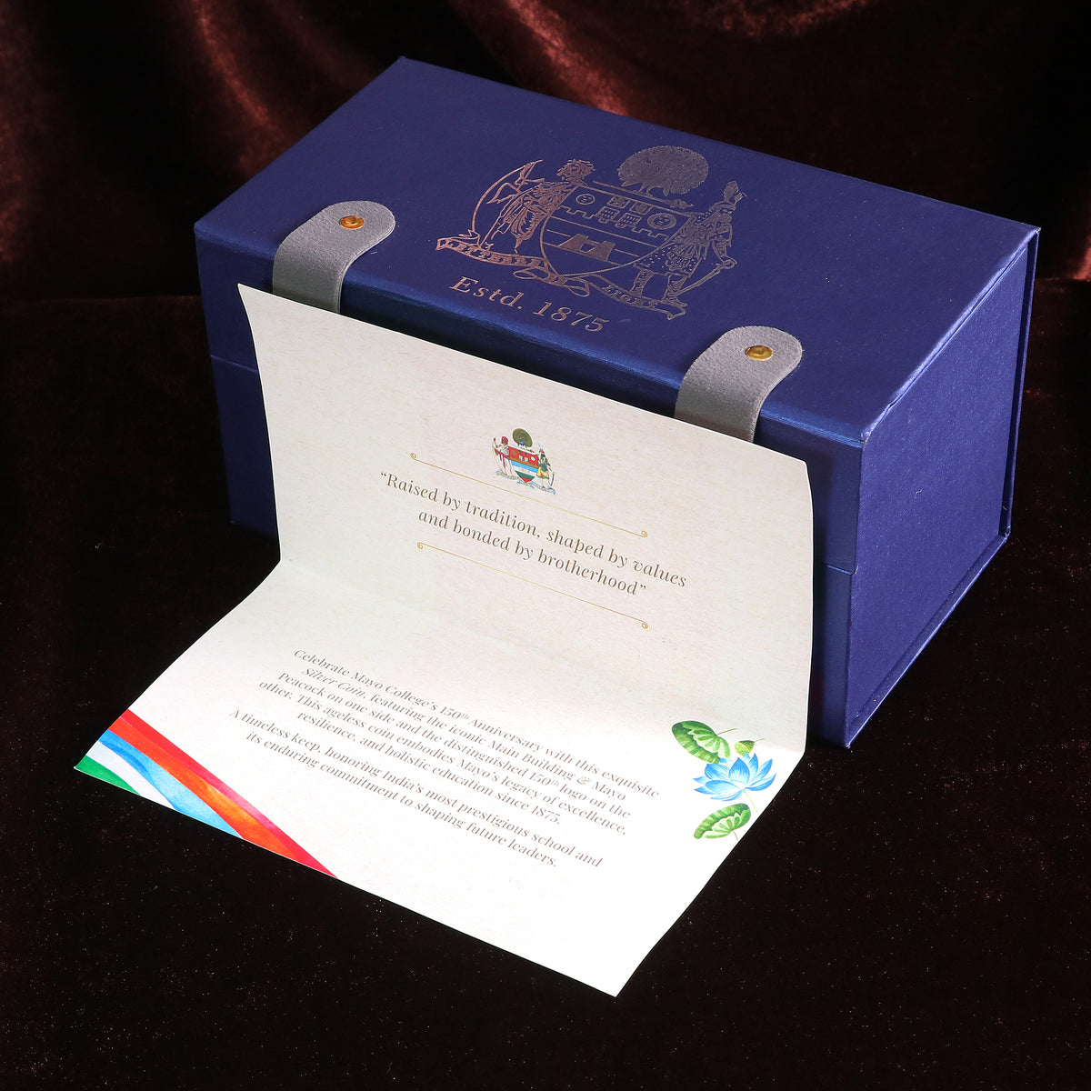 Celebrate Mayo College’s 150th anniversary with this exquisite Mayo Signature 10gm Silver Coin, featuring the iconic Mayo Peacock on one side and the distinguished 150th logo on the other. This ageless coin embodies Mayo’s legacy of excellence, resilience, and holistic education since 1875. A timeless keep, honoring India’s most prestigious school and its enduring commitment to shaping future leaders.
